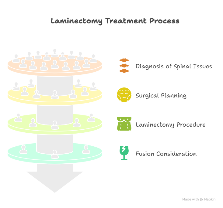 - روش: جراح بخشی یا تمام لایه (قوس استخوانی در پشت مهره ها) را برمی دارد. این باعث ایجاد فضای بیشتری در کانال نخاعی می شود و ساختارهای عصبی را از حالت فشرده خارج می کند. بسته به میزان باریک شدن و رویکرد، می توان آن را از طریق جراحی باز سنتی یا تکنیک های کم تهاجمی، با استفاده از میکروسکوپ یا آندوسکوپ انجام داد. اگر بی ثباتی پس از رفع فشار نگران کننده باشد، ممکن است فیوژن به طور همزمان انجام شود.