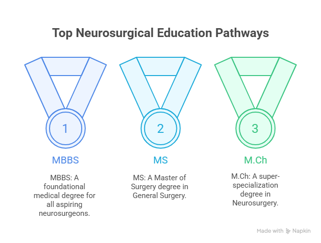 - آموزش دقیق: یک جراح مغز و اعصاب برتر تحصیلات پزشکی گسترده (MBBS) را به پایان رسانده است و پس از آن کارشناسی ارشد جراحی (MS) در جراحی عمومی و سپس مدرک فوق تخصصی مانند M.Ch (Magister Chirurgiae) در جراحی مغز و اعصاب از یک موسسه بسیار معتبر را به پایان رسانده است. برخی همچنین ممکن است DNB (دیپلمات هیئت ملی) را در جراحی مغز و اعصاب داشته باشند.